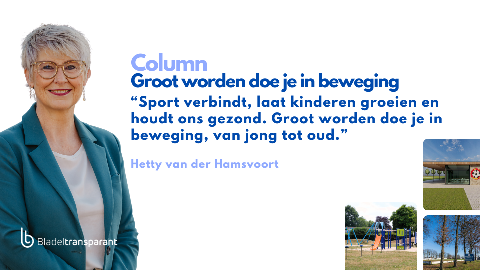 Als moeder bracht ik heel wat uurtjes langs de lijn door bij voetbal, hockey en turnen. Aanmoedigen, rijden naar uitwedstrijden en gezellig praten met andere ouders. Sport verbroedert, van jong tot oud. Als bestuurder van een grote voetbalclub heb ik die maatschappelijke functie van dichtbij ervaren. De sportvereniging is een plek waar kinderen groeien, volwassenen verantwoordelijkheid nemen en trainers een luisterend oor bieden als het even tegenzit.