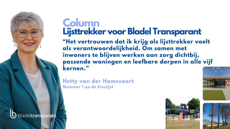 Tijdens de ledenvergadering van Bladel Transparant ben ik unaniem benoemd tot lijsttrekker voor de gemeenteraadsverkiezingen van maart 2026. Dat voelt niet als een stap omhoog, maar als een stap naar voren. Naar de inwoners toe.